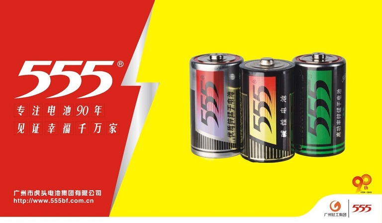 555品牌秉乘广州市虎头电池集团有限公司精益求精、一丝不苟的传统,历经90年的岁月洗礼,匠心铸造,在品质、环保方面不断创新,将高效、节能、环保与卓越的品质自然地融为一体。555品牌的产品种类繁多,包括无汞碱性电池系列、无汞高功率电池、无汞高功率印塑电池、无汞高容量印塑电池、优质铁壳电池系列、优质全防电池、扣式锂锰电池、锂电池系列等。555牌碱性电池更是国家首批绿色环保碱锰电池,其中锌锰系列和碱性锌锰系列电池获得出口免检证书,并荣获广东省及广州市著名商标和“广州老字号”称号。经过多年的品牌培育,555品牌已是华南地区的电池一线品牌,在广东省电池市场的占有率达到6成以上。
